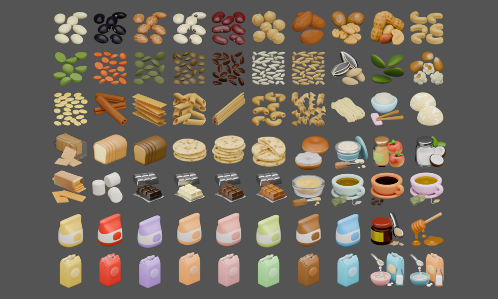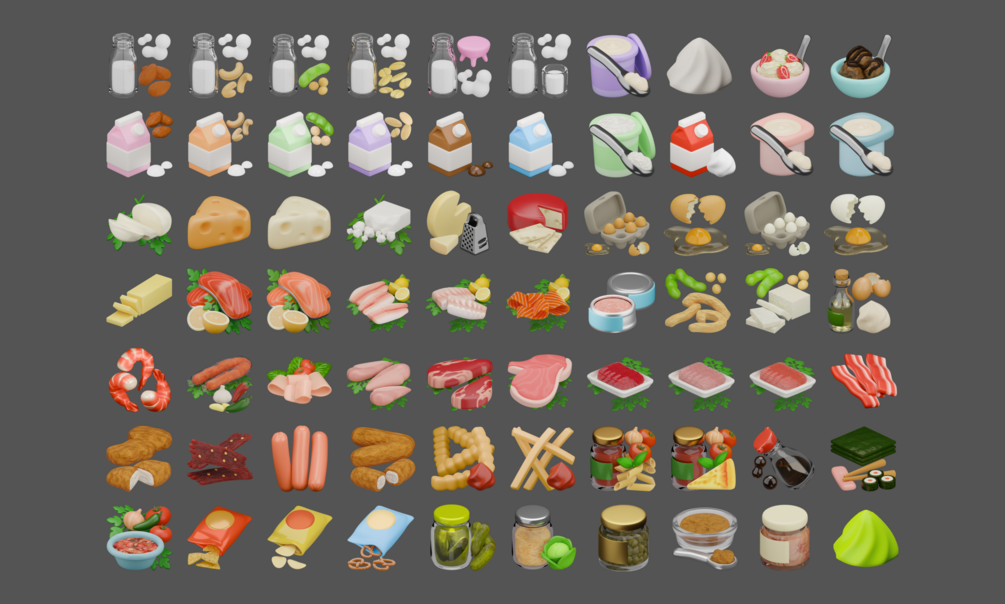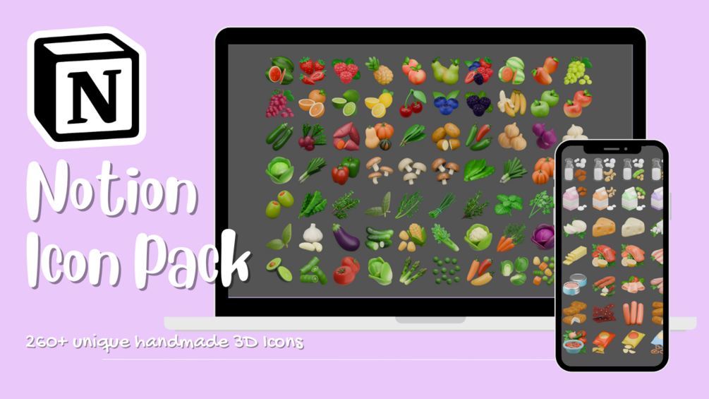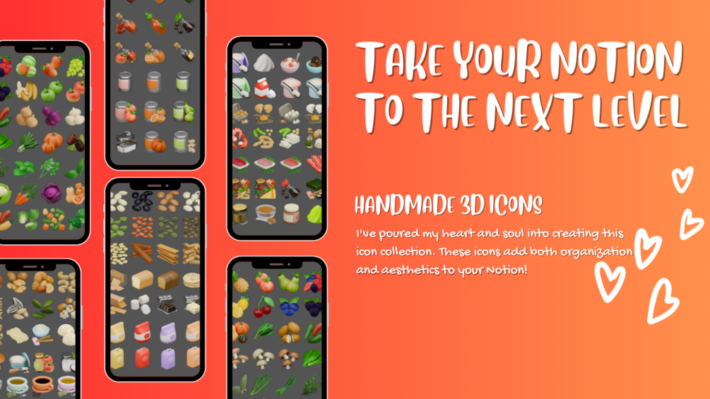 I've designed and handcrafted over 260+ unique icon assets to take your Notion experience to the next level. These icons aren't just functional; they're adorable too. Made in 3D modeling software called Blender, I've poured my heart and soul into creating a collection that adds both organization and aesthetics to your grocery lists.